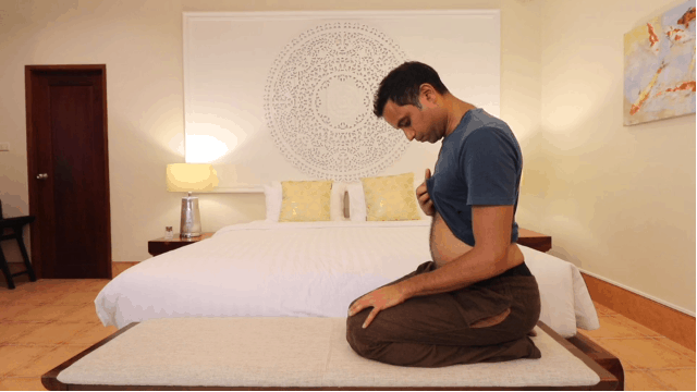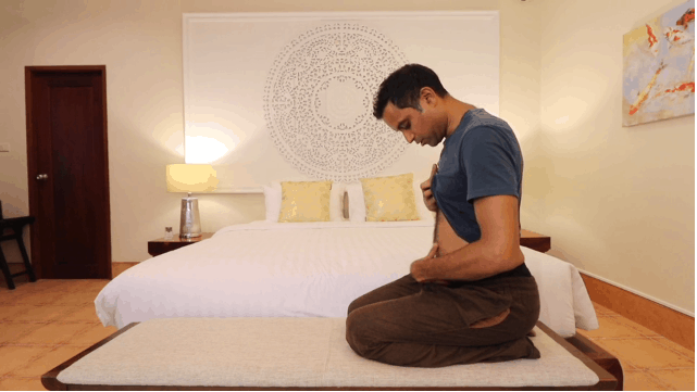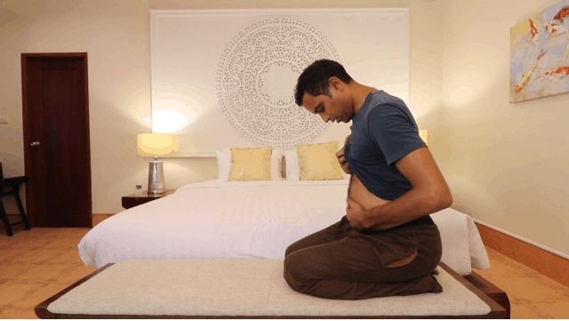 2.) Kneel in a comfortable position with your back upright. Make sure the muscles of your abdomen are very relaxed.